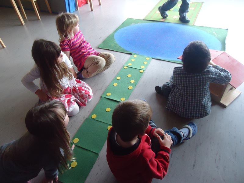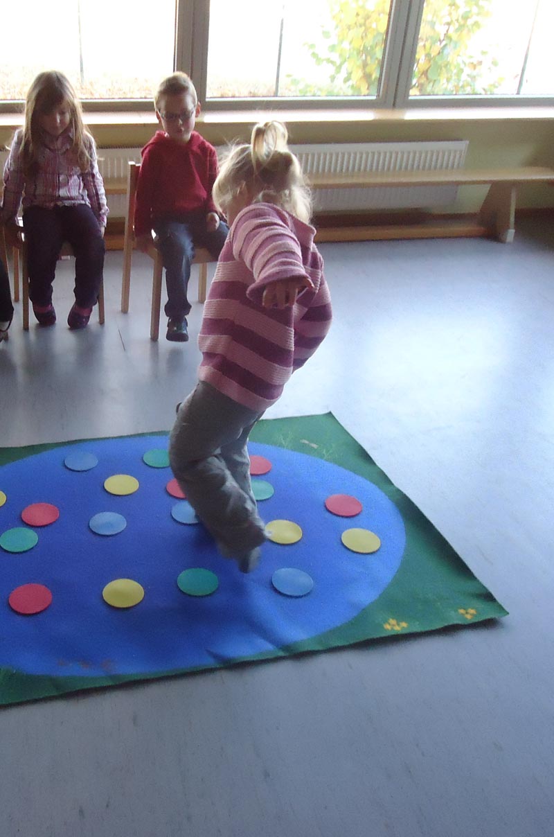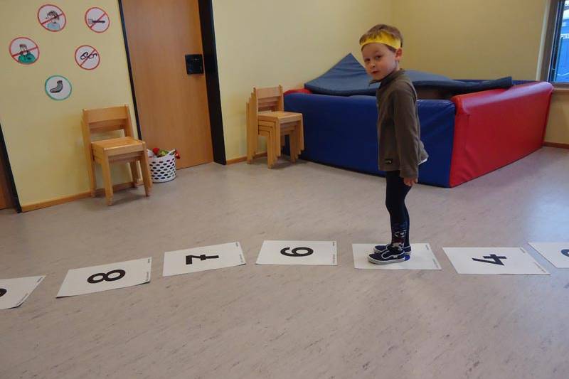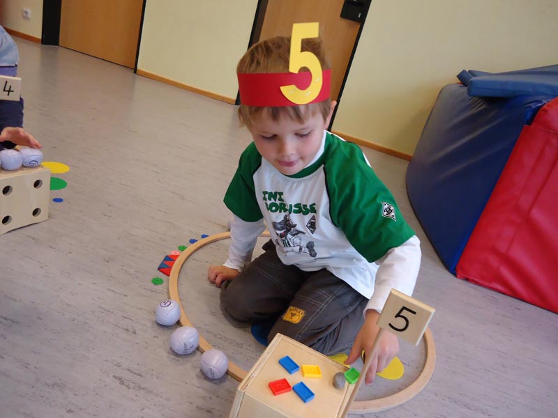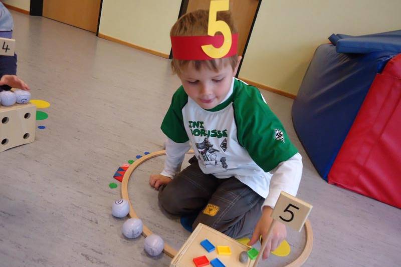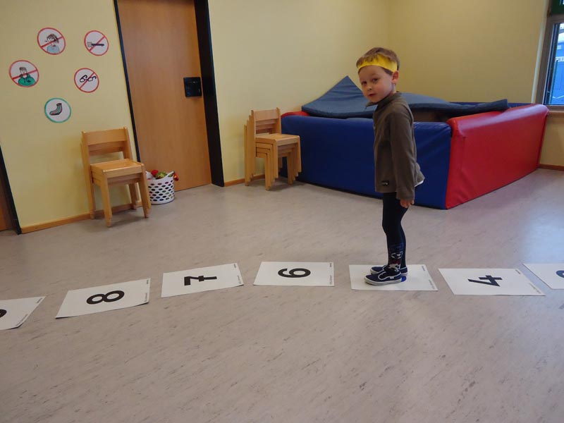Rechenaspekte im Zahlenweg (ich stehe auf Nummer 3 und gehe 2 Schritte weiter bis zur 5)