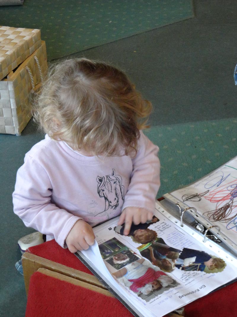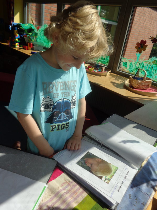Neben den jährlich erstellten Bildungsdokumentationen, die die Bereiche: Grobmotorik, Feinmotorik, Sprache, Kognitivität und sozial-emotionales Verhalten beinhalten, haben die Kinder selbst die Möglichkeit durch ihr sog. Portfolio einen Überblick über ihre eigene Entwicklung zu erhalten. In diesem Portfolio sehen sie durch Fotos, Lerngeschichten und eigenem Gemalten, wie sich ihre Bedürfnisse und Fähigkeiten mit steigendem Alter verändert haben.