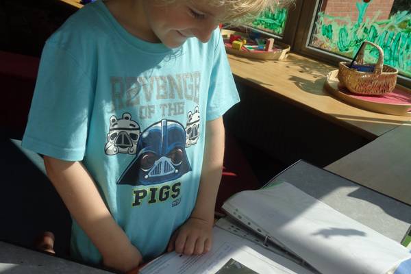 Erzieherin schreibt etwas auf einen Zettel. Ad: „Was schreibst du da?“ Erzieherin:“ Dass du neugierig bist!“ Ad: „Oh ja das kannst du schreiben, das bin ich nämlich auch!“